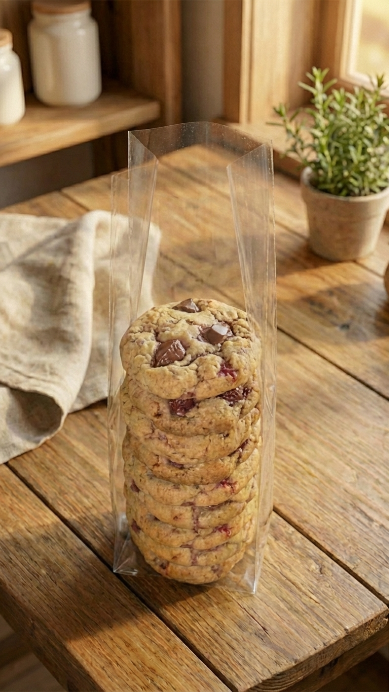 Túi đựng bánh quy, bánh kẹo trong suốt là loại công cụ phục vụ quá trình làm bánh trở nên thuận tiện hơn cho những tín đồ mê làm bánh.Túi đựng bánh quy với thiết kế đơn giản và trong suốt dùng để đựng bánh quy, bánh hạnh nhân, trà hoa khô, kẹo các loại,… nhằm kéo dài thời gian bảo quản thực phẩm.
